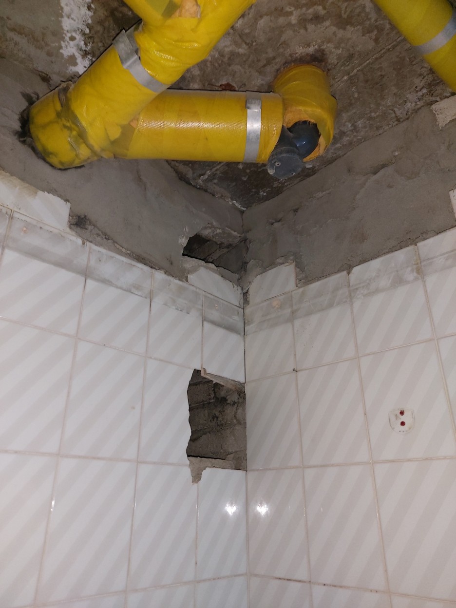 기존 수도배관을 잘라서 이어야 하고, 새로운 배관이 들어가야 하기때문에.. 수도배관이 보이도록 벽을 깨줍니다.