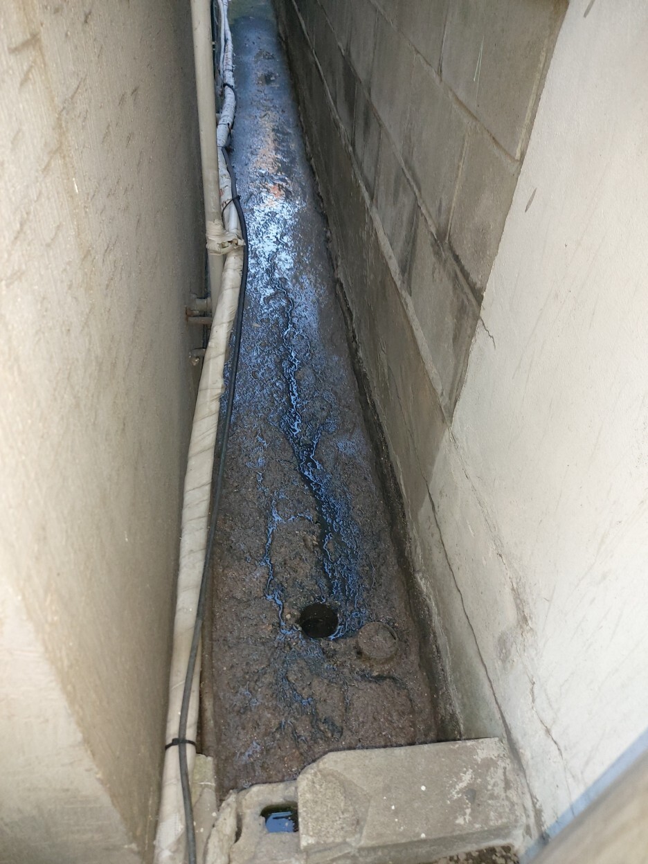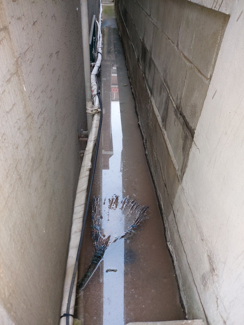 빌라 외벽 옆 통로에 물이 가득 차 있습니다. 이 상황은 세대 하수구가 막힌게 아니라, 건물의 메인 하수구가 막힌겁니다.