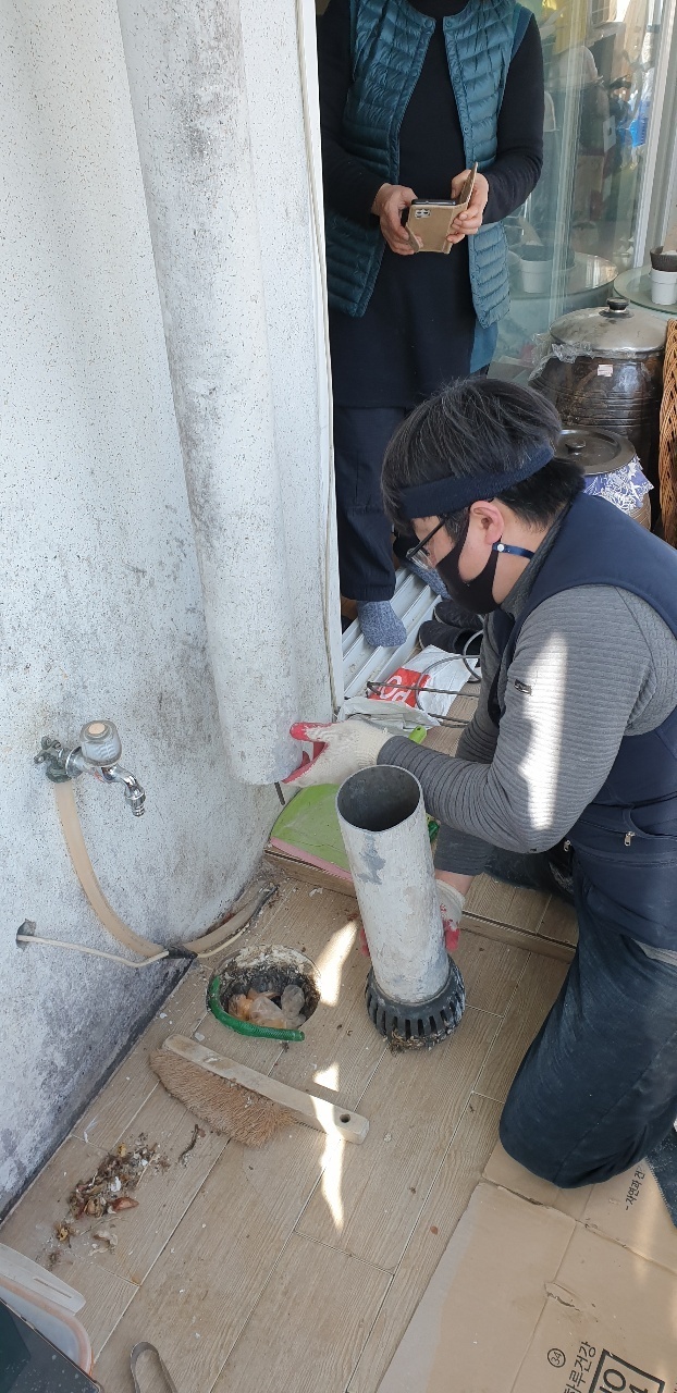 군포시 금정동의 아파트에서 베란다 우수관에서 누수가 된다는 연락을 받고 출동합니다.