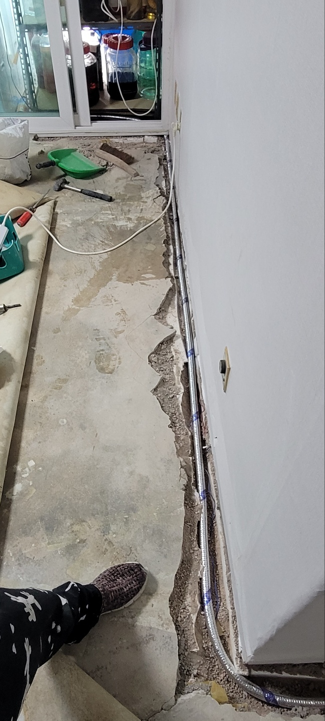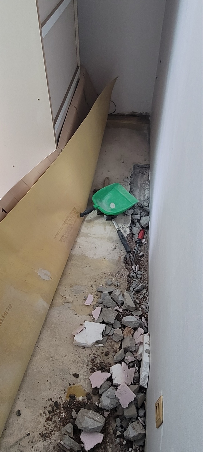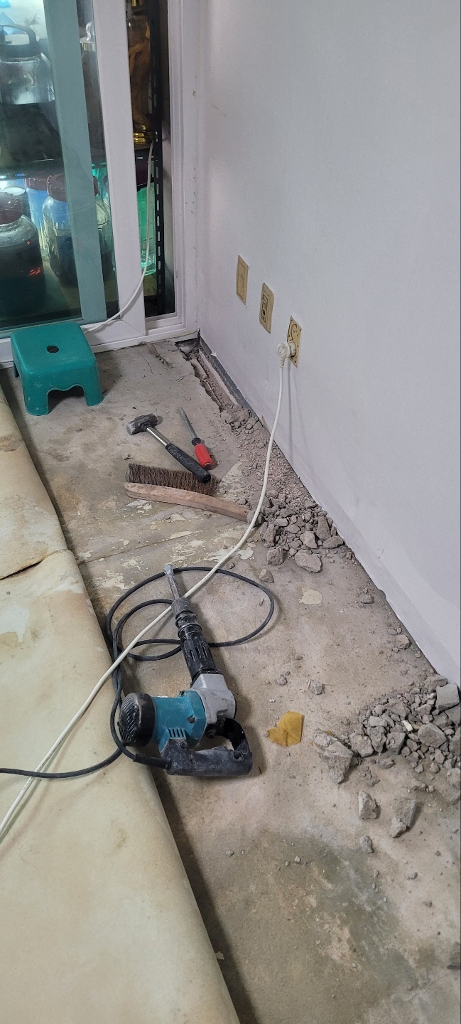 집 전체 바닥에 묻혀있는 수도배관을 끊어버리고(그대로 묻힌채로 둡니다.) 새로운 수도배관을 심을 가장자리부분을 깹니다.