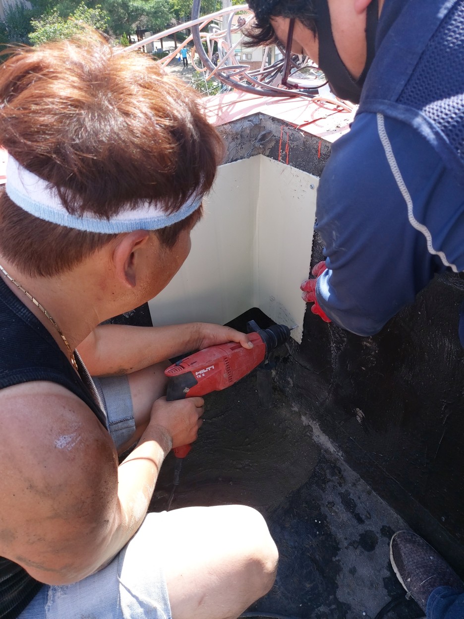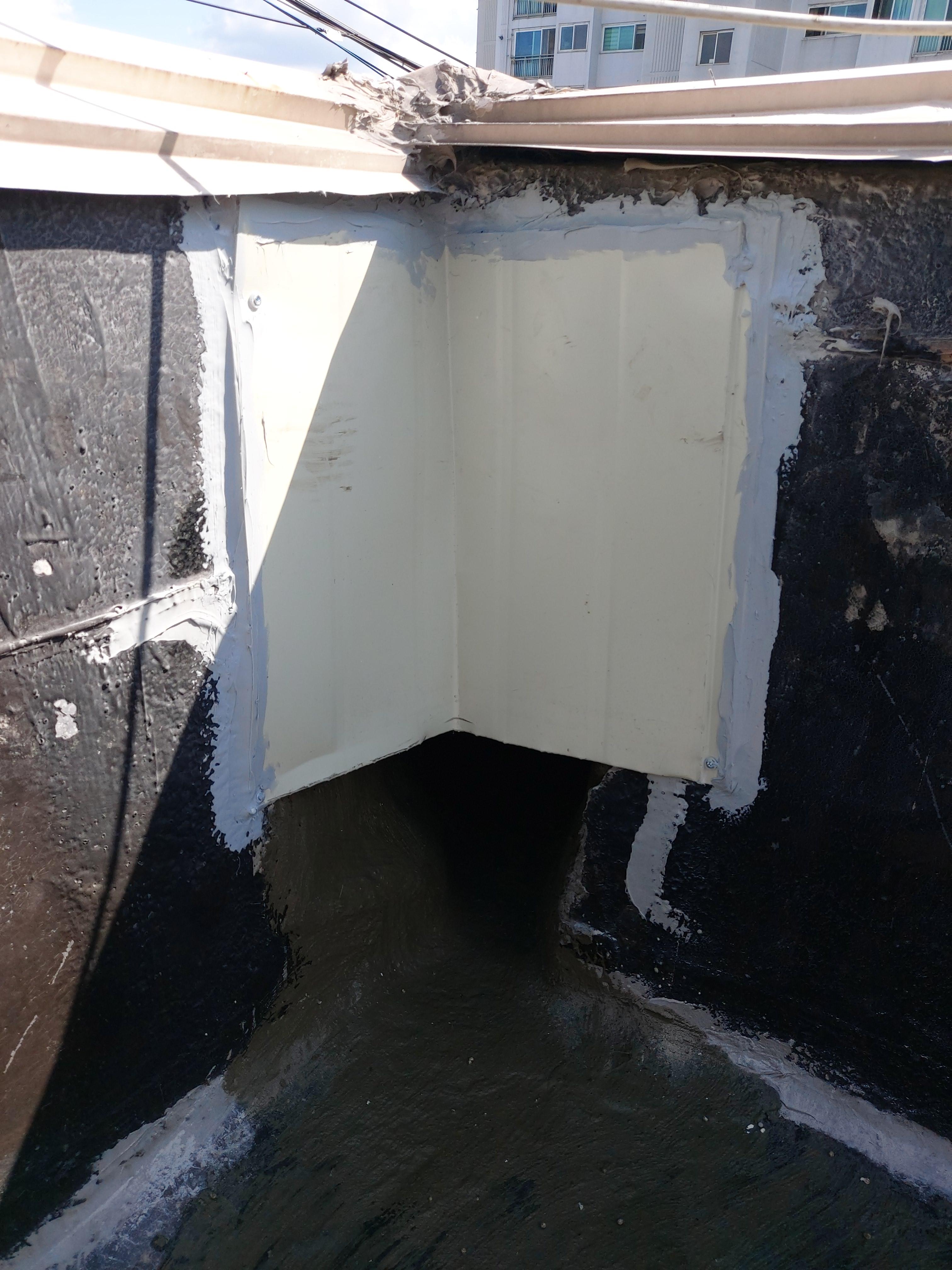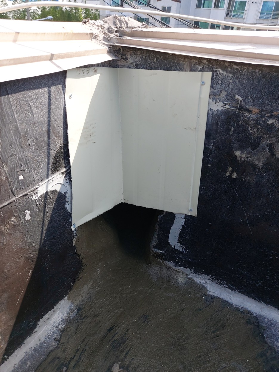 옥상 좌,우측 우수관 배수로 방수공사 작업 마무리합니다.