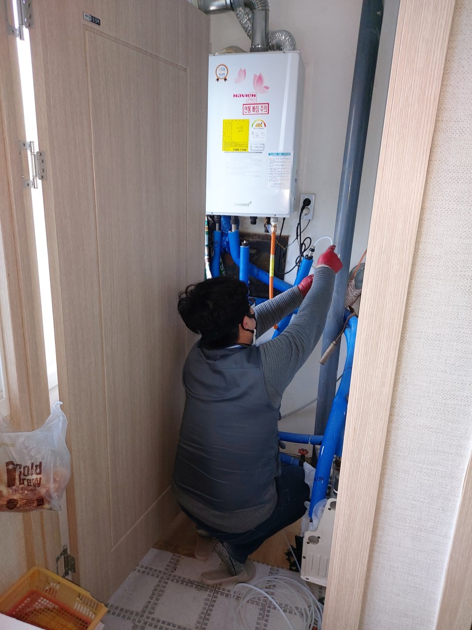 냉, 온수 배관을 분리하고 해빙기 스팀을 열심히 쏴서 얼었던 배관을 녹이는 중입니다.