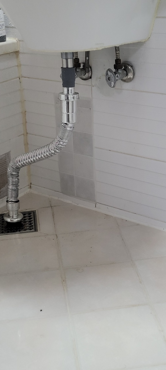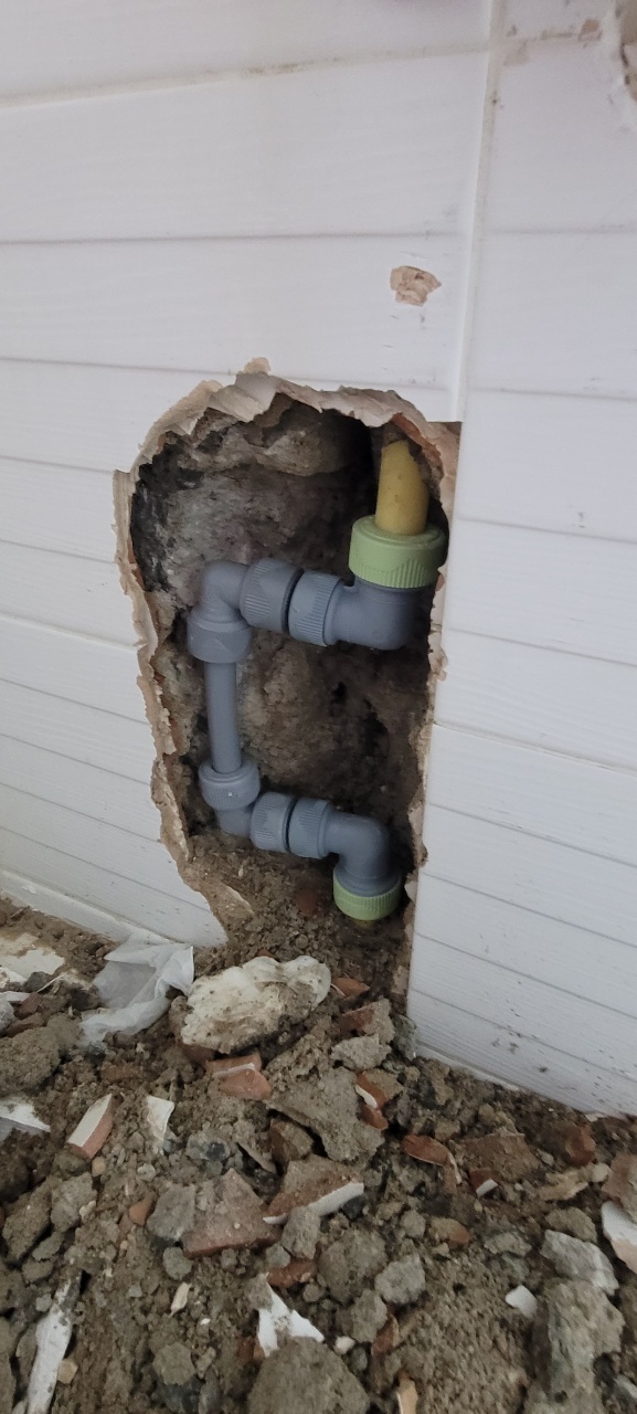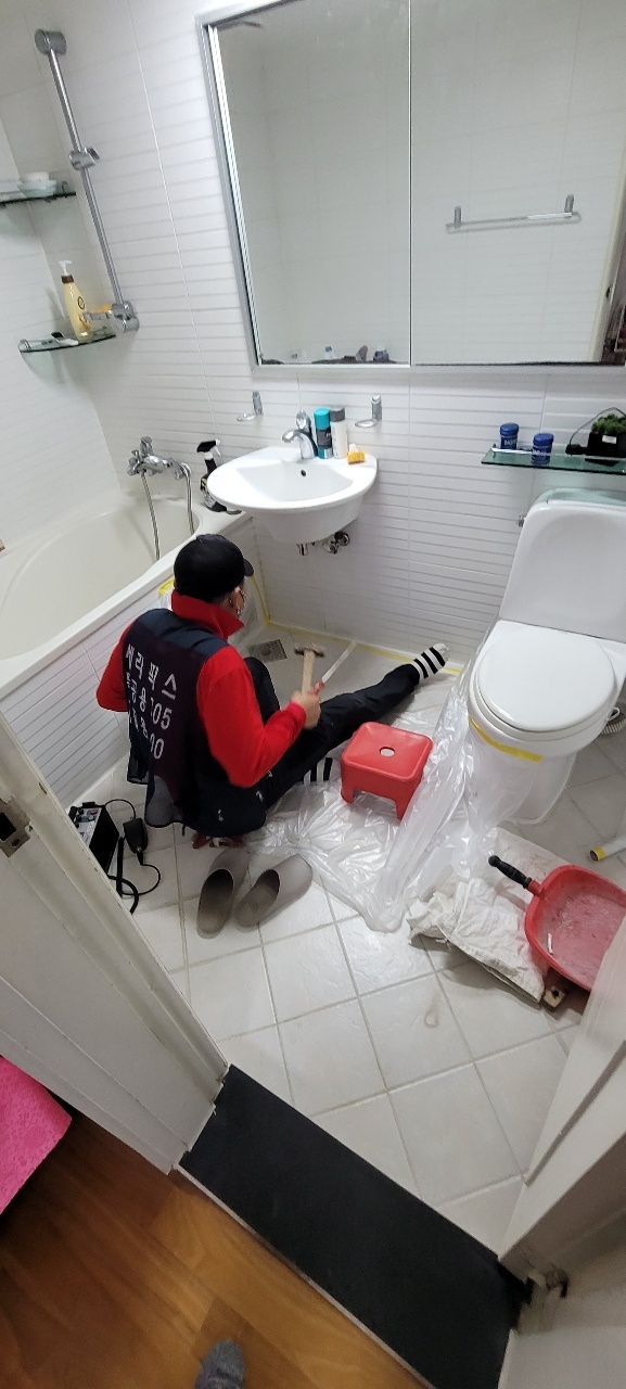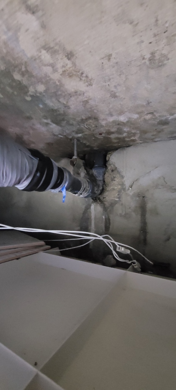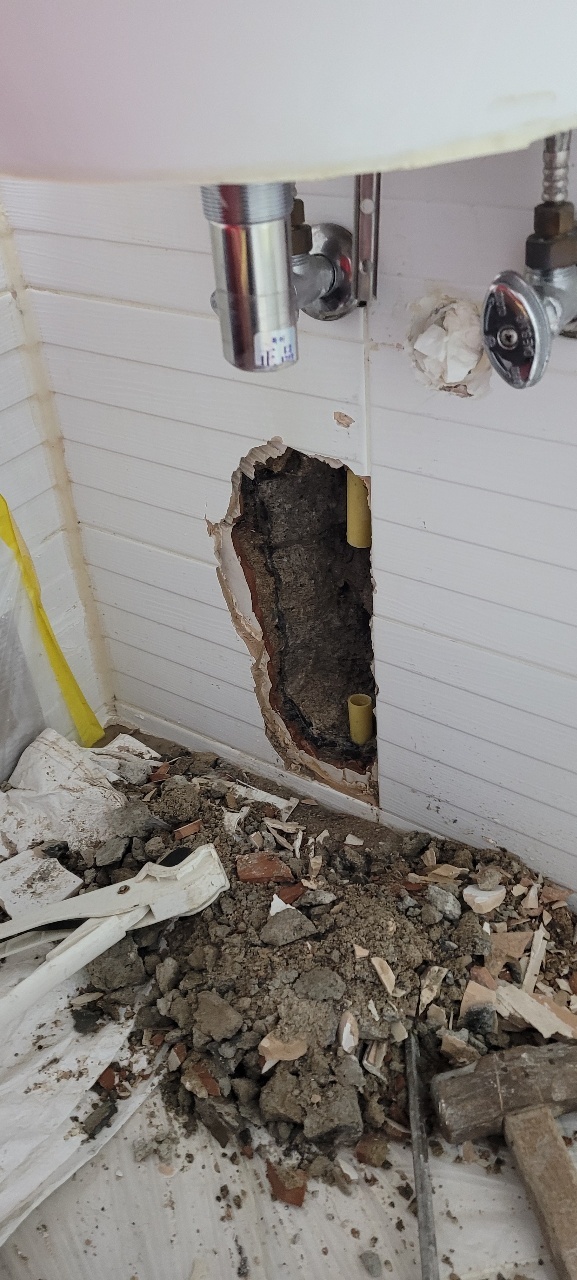 누수탐지 결과 화장실 세면대 밑의 온수배관이 가장 의심이 되서.. 세면대 밑의 벽을 깹니다.