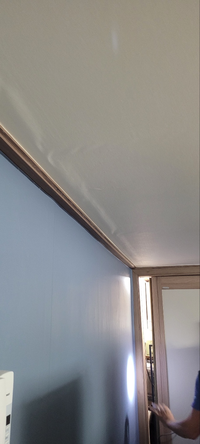 천장 벽지가 젖어서 밑으로 물이 떨어지는 상황입니다.